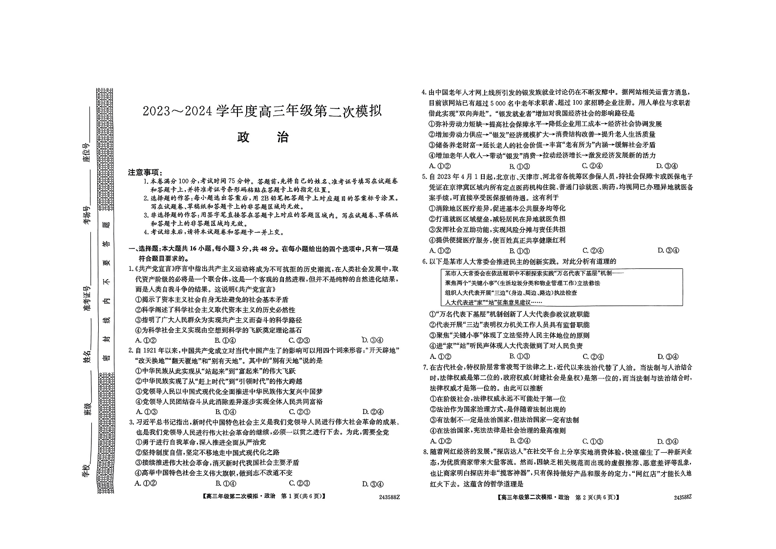 黑龙江省2024届部分学校高三下学期第二次模拟考试政治