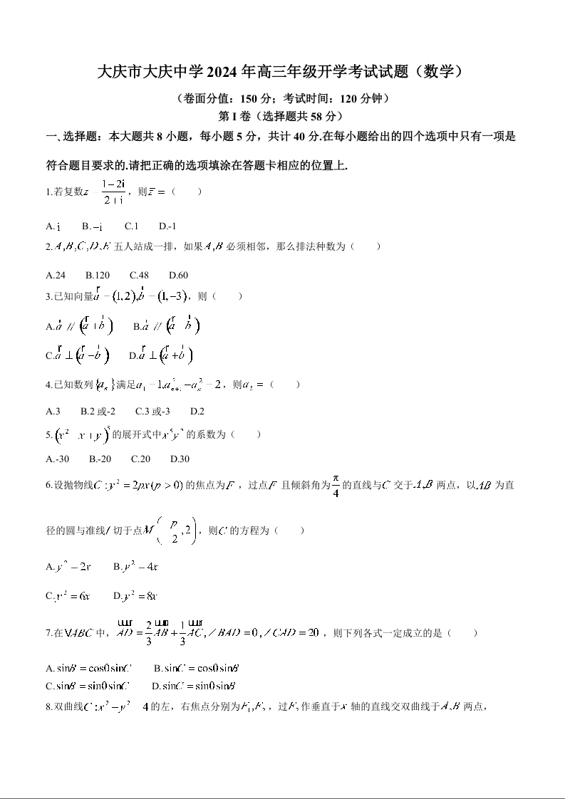 黑龙江省大庆市大庆中学2024届高三下学期开学考试数学+答案