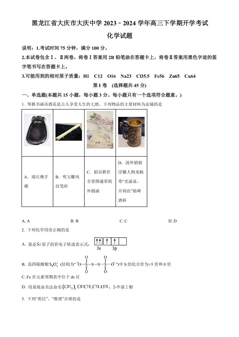 黑龙江省大庆市大庆中学2024届高三下学期开学考试化学(原卷版)
