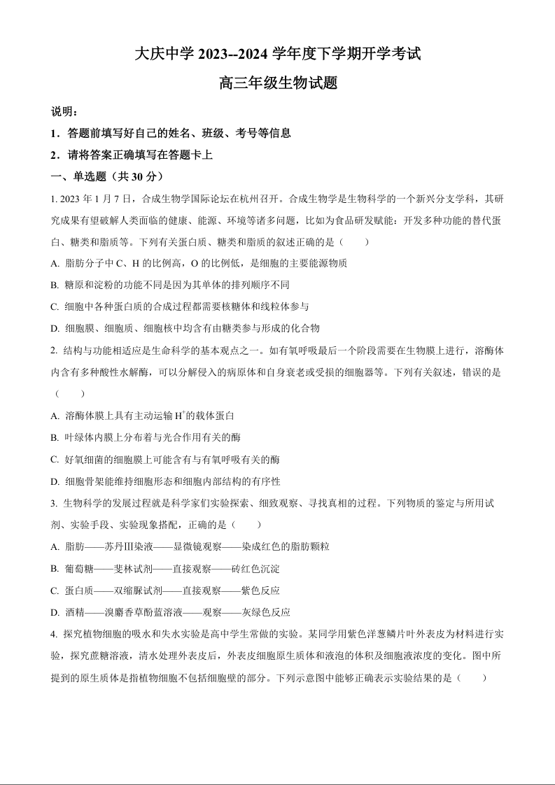 黑龙江省大庆市大庆中学2024届高三下学期开学考试生物(原卷版)