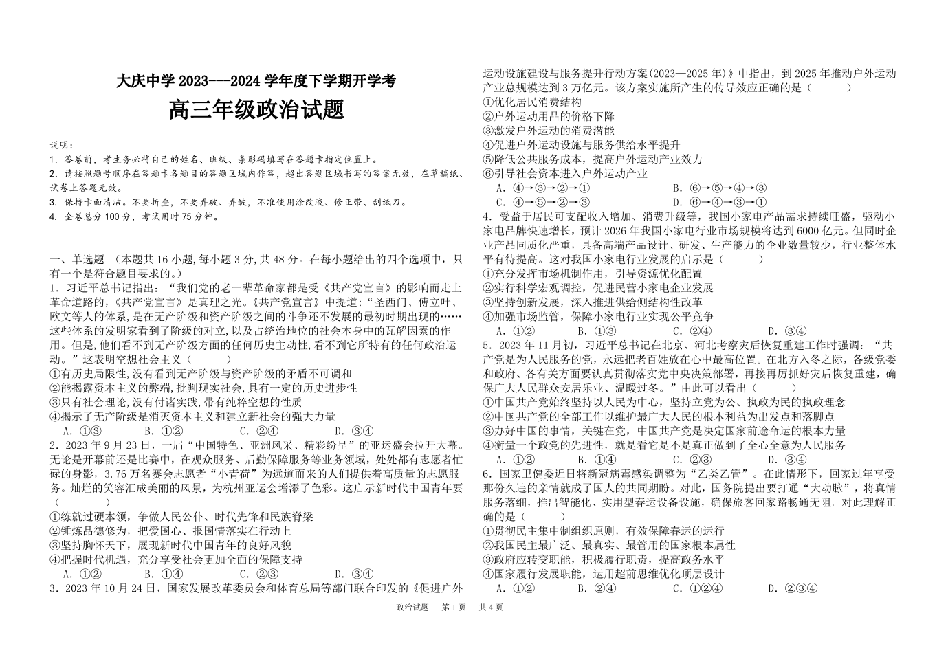 黑龙江省大庆市大庆中学2024届高三下学期开学考试政治