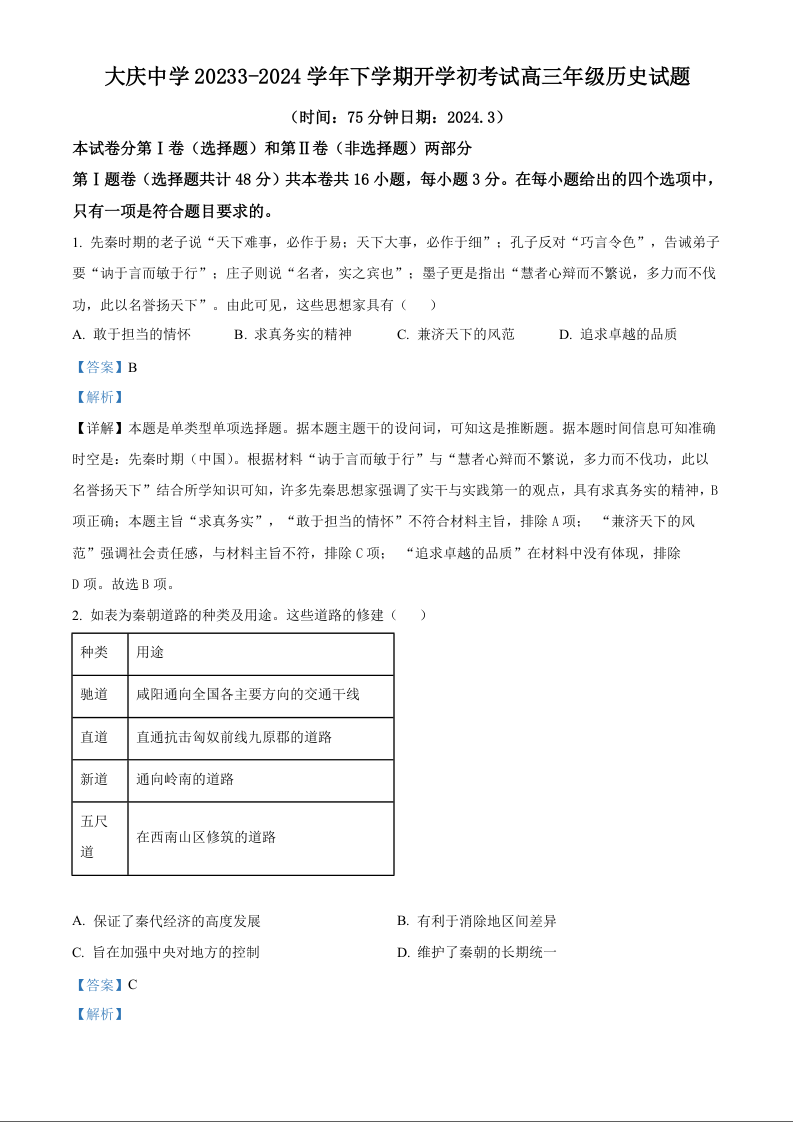 黑龙江省大庆市大庆中学2024届高三下学期开学考试历史(精品解析版)