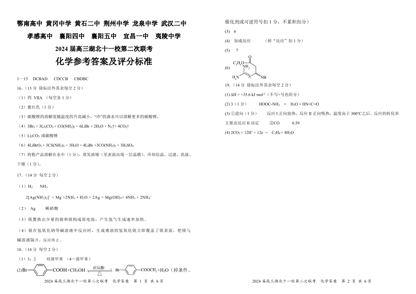 湖北省十一校2024届高三下学期第二次联考化学答案