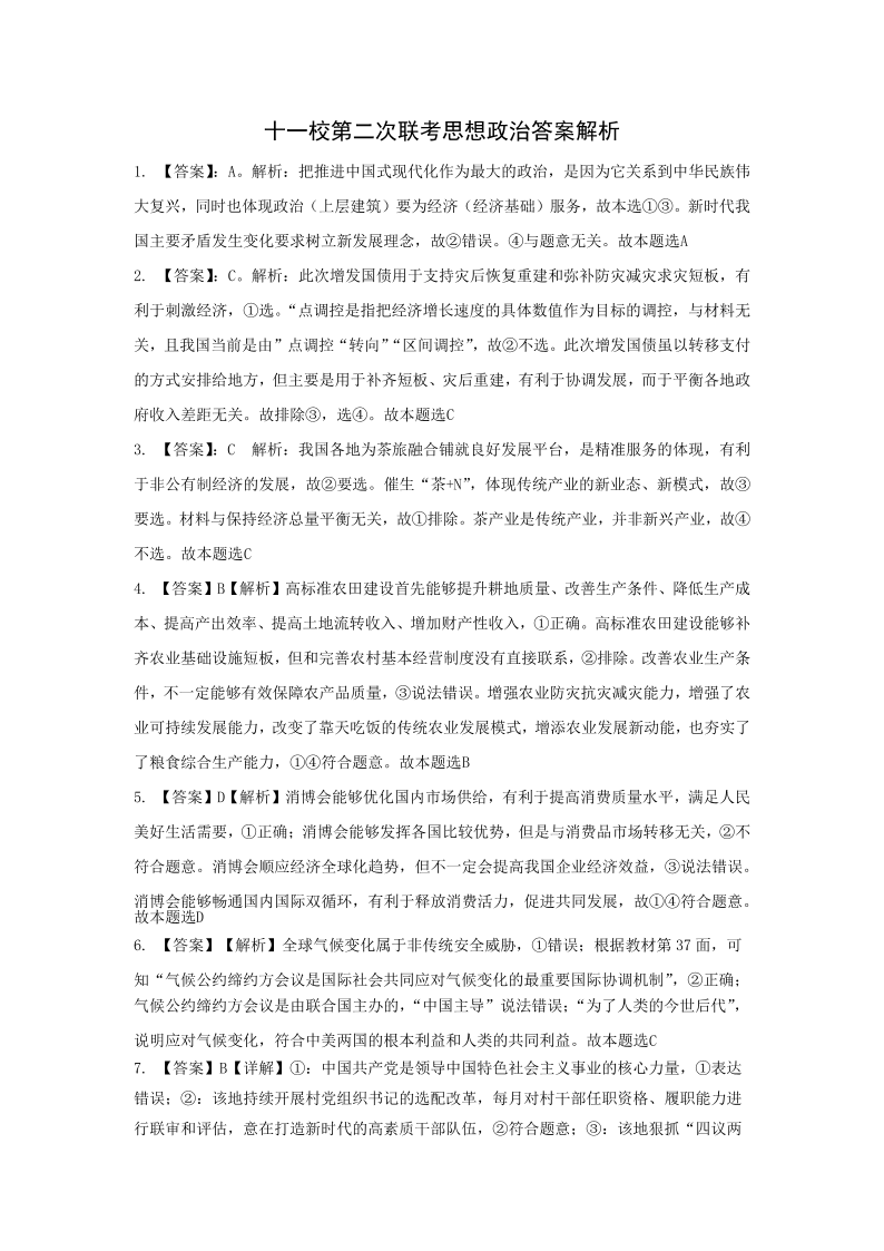 湖北省十一校2024届高三下学期第二次联考政治答案