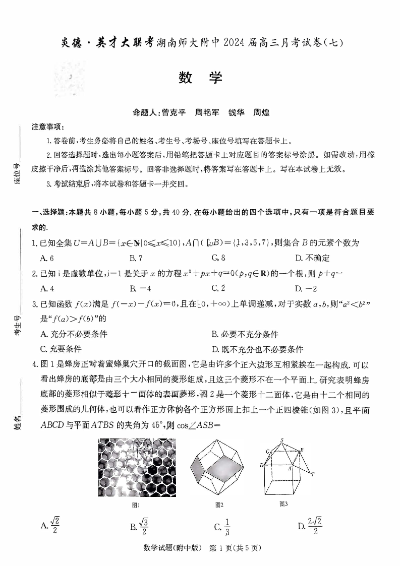 湖南省师范大学附属中学2024届高三月考(七)数学