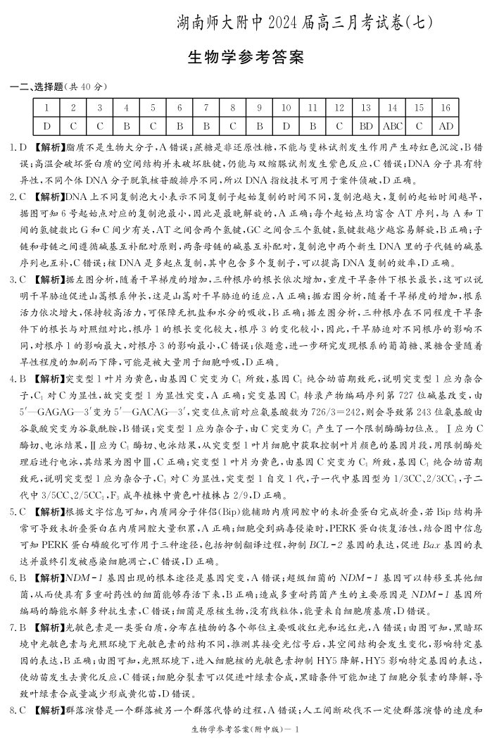 湖南省师范大学附属中学2024届高三月考(七)生物答案