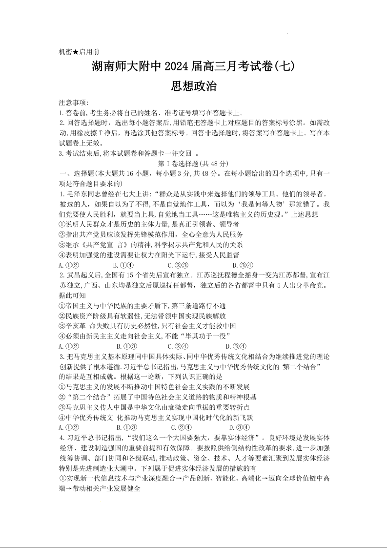湖南省师范大学附属中学2024届高三月考(七)政治