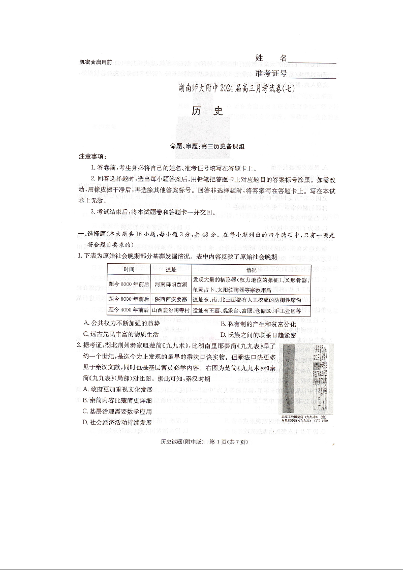 湖南省师范大学附属中学2024届高三月考(七)历史
