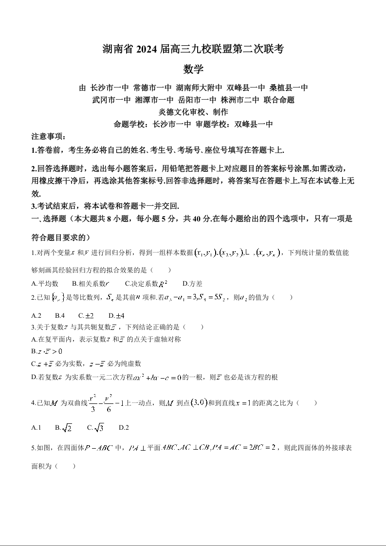 湖南省九校联盟2024届高三下学期第二次联考数学+答案