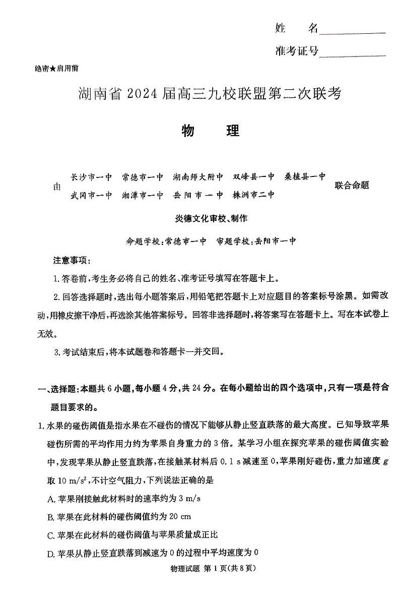 湖南省九校联盟2024届高三下学期第二次联考物理