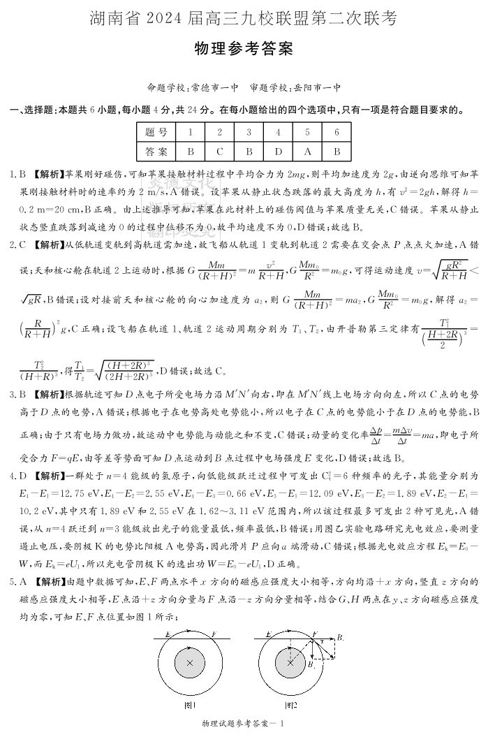 湖南省九校联盟2024届高三下学期第二次联考物理答案