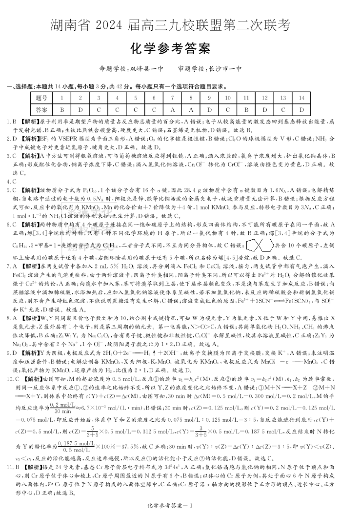 湖南省九校联盟2024届高三下学期第二次联考化学答案
