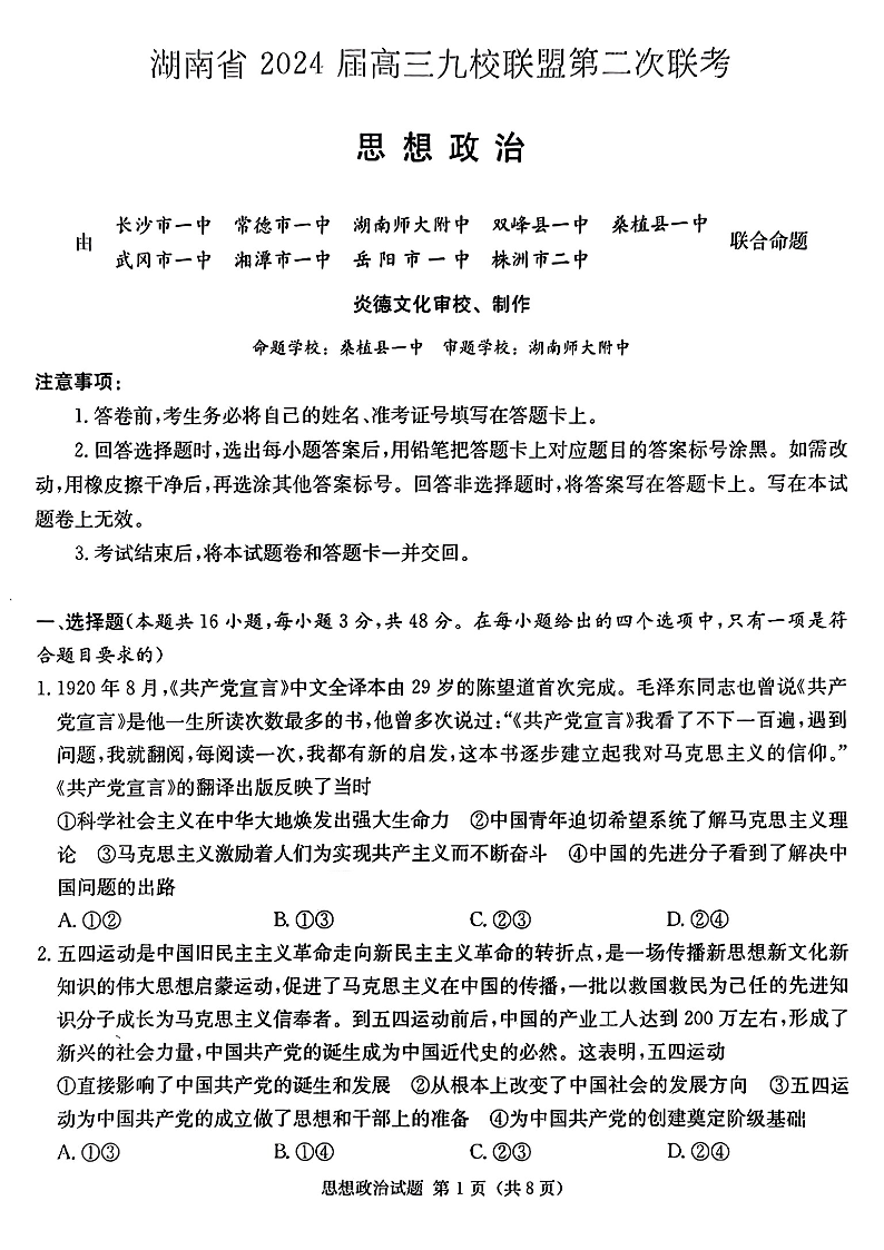 湖南省九校联盟2024届高三下学期第二次联考政治