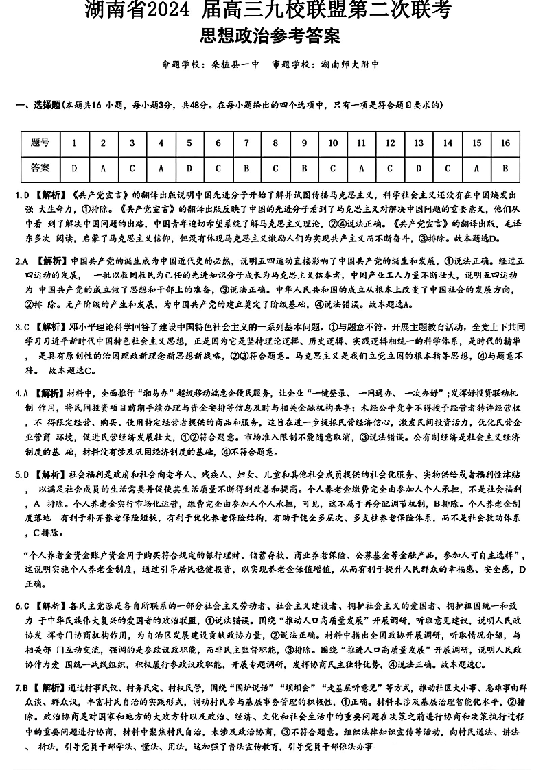 湖南省九校联盟2024届高三下学期第二次联考政治答案