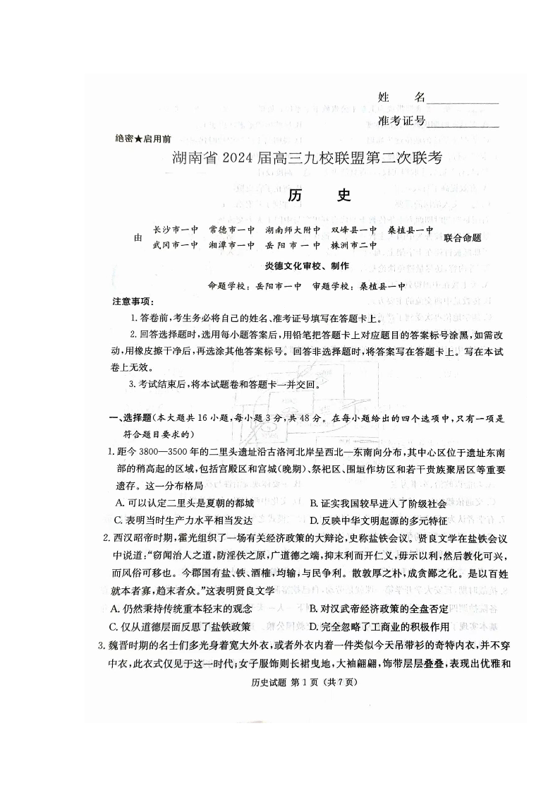湖南省九校联盟2024届高三下学期第二次联考历史