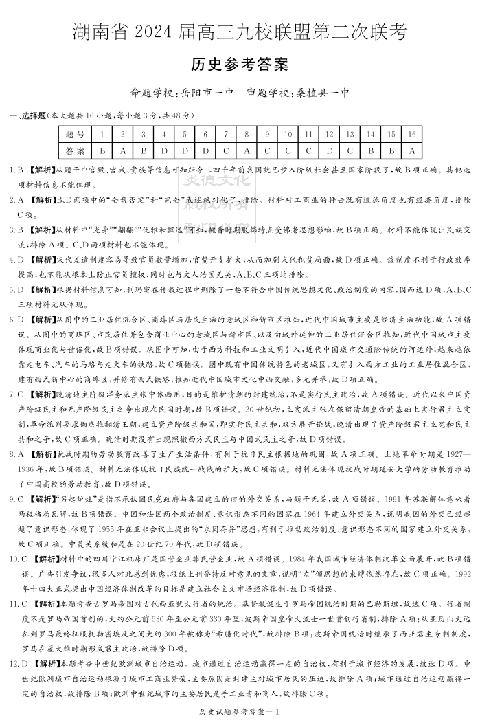 湖南省九校联盟2024届高三下学期第二次联考历史答案