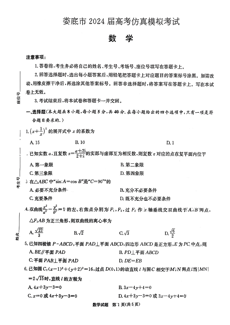 湖南省娄底市2024届高三下学期仿真模拟考试(娄底三模)数学+答案