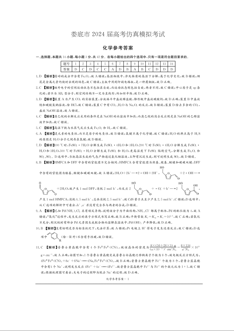 湖南省娄底市2024届高三下学期仿真模拟考试(娄底三模)化学答案