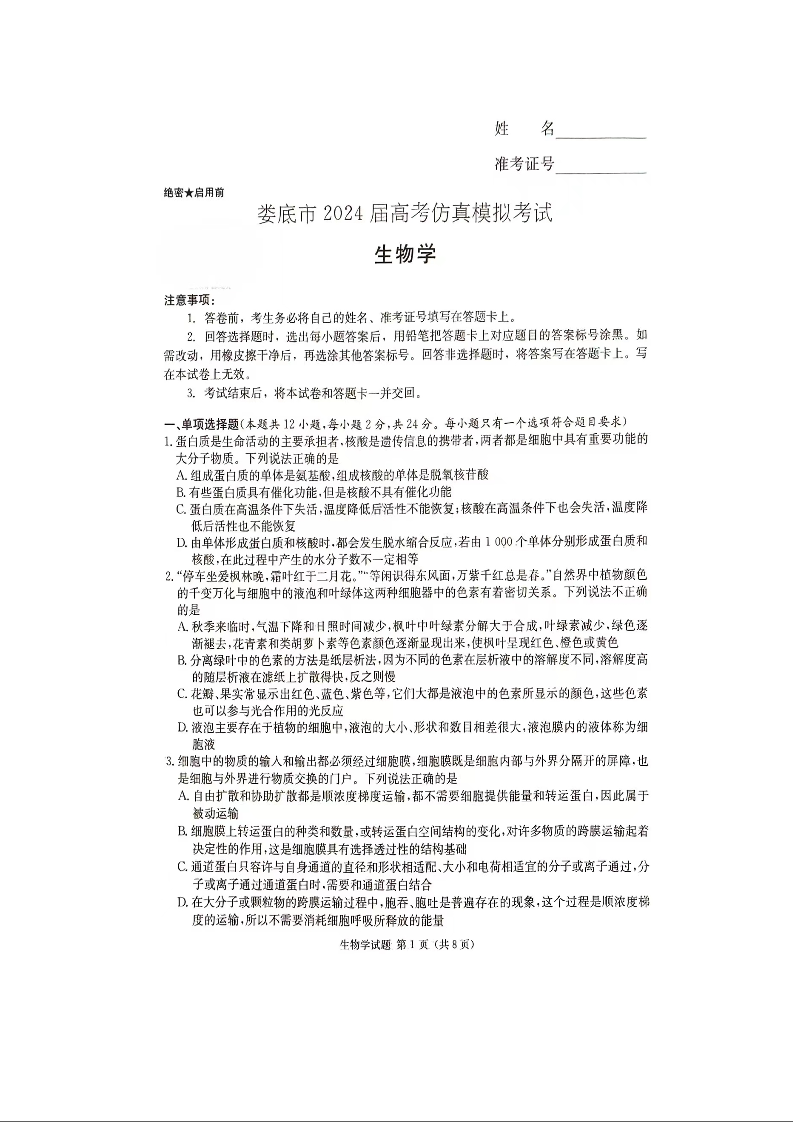 湖南省娄底市2024届高三下学期仿真模拟考试(娄底三模)生物