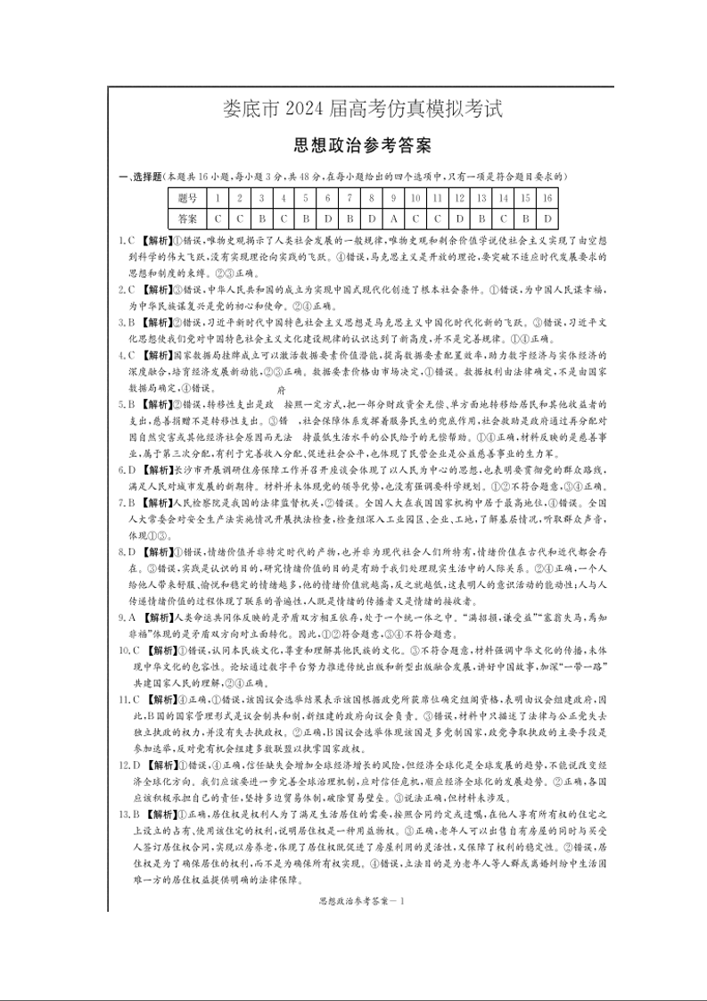 湖南省娄底市2024届高三下学期仿真模拟考试(娄底三模)政治答案