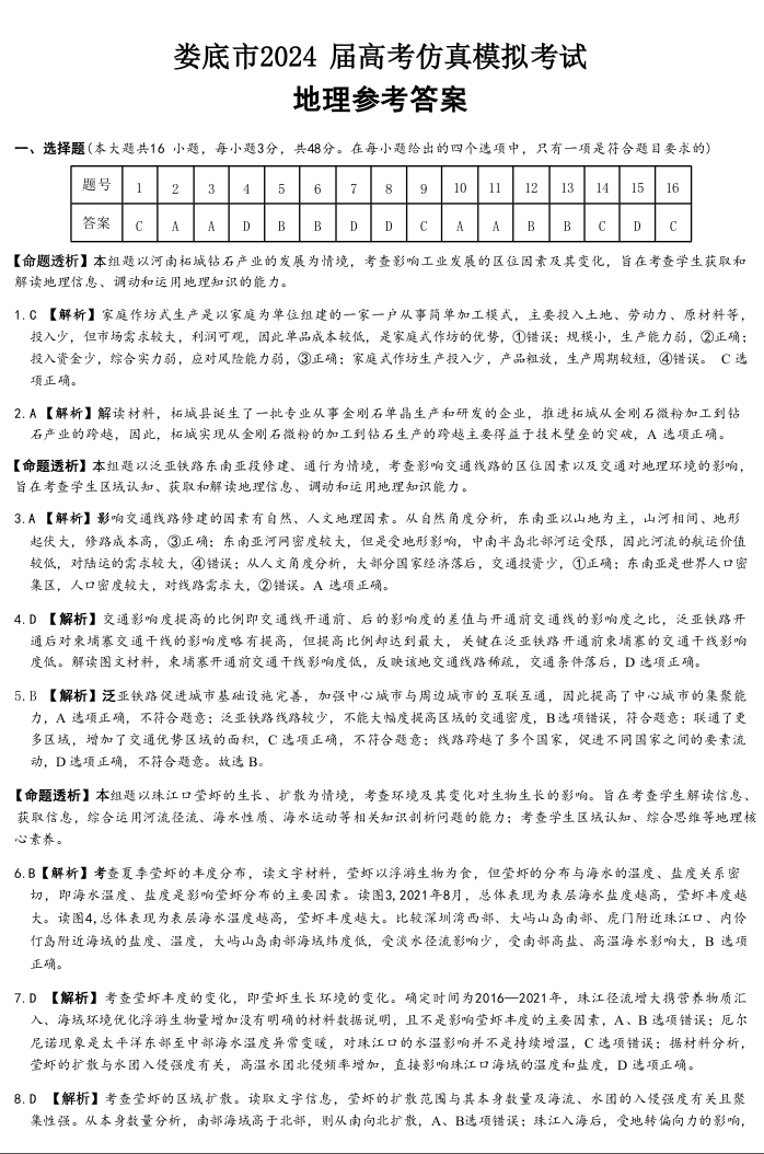 湖南省娄底市2024届高三下学期仿真模拟考试(娄底三模)地理答案