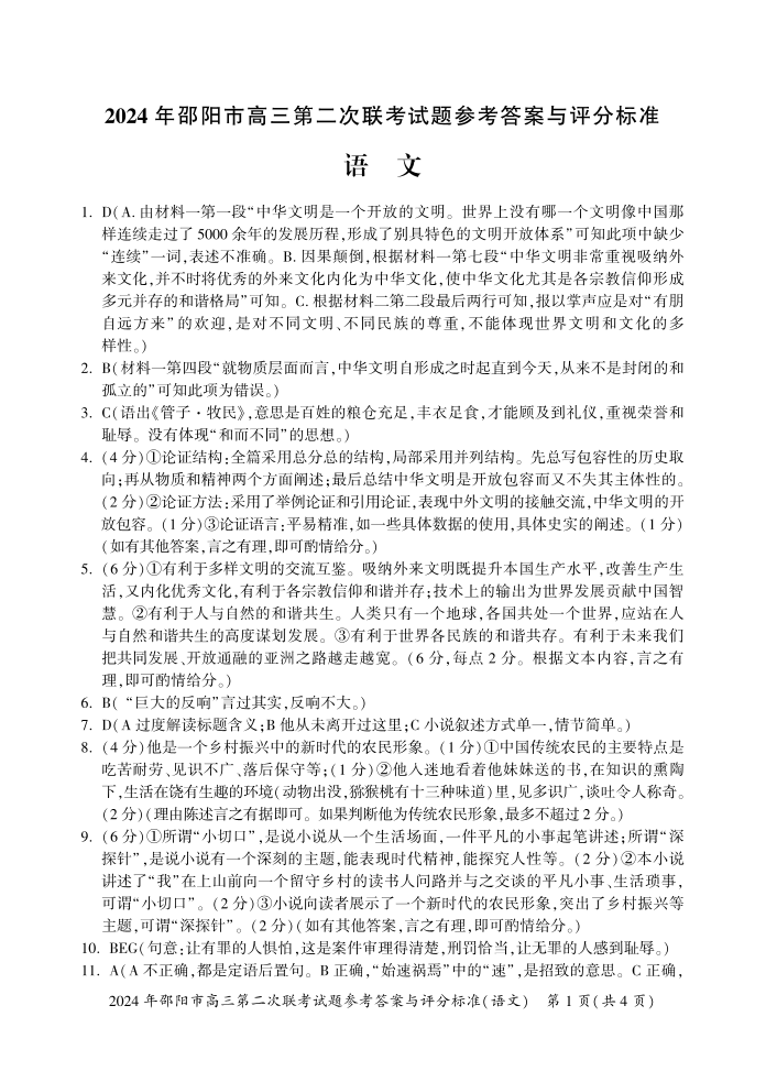 湖南省邵阳市2024届高三下学期二模(邵阳二模)语文答案