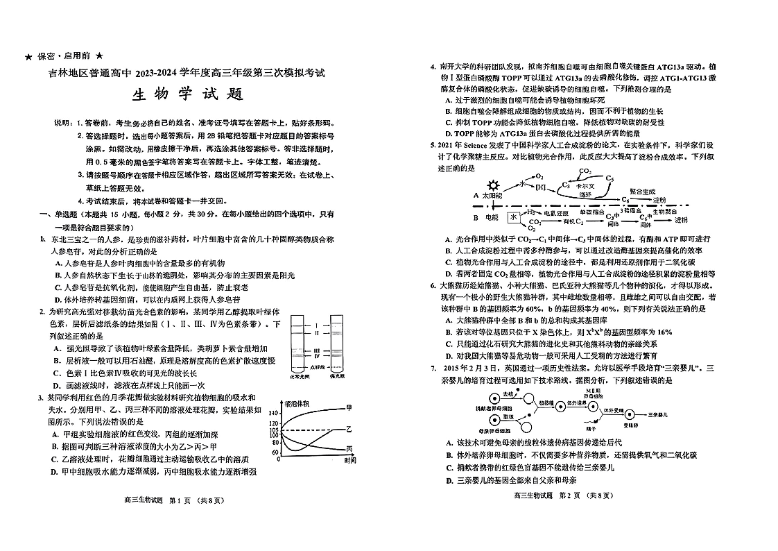 2024届吉林省吉林地区普通高中高三三模考试生物+答案