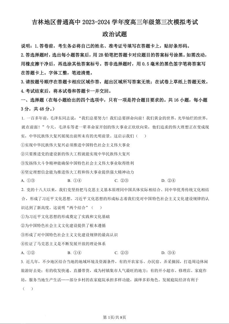 吉林省吉林地区2024届普通高中高三三模考试政治(原卷版)