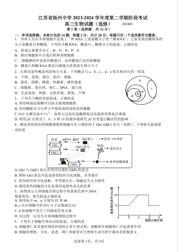 江苏省扬州中学2024届高三下学期阶段练习生物