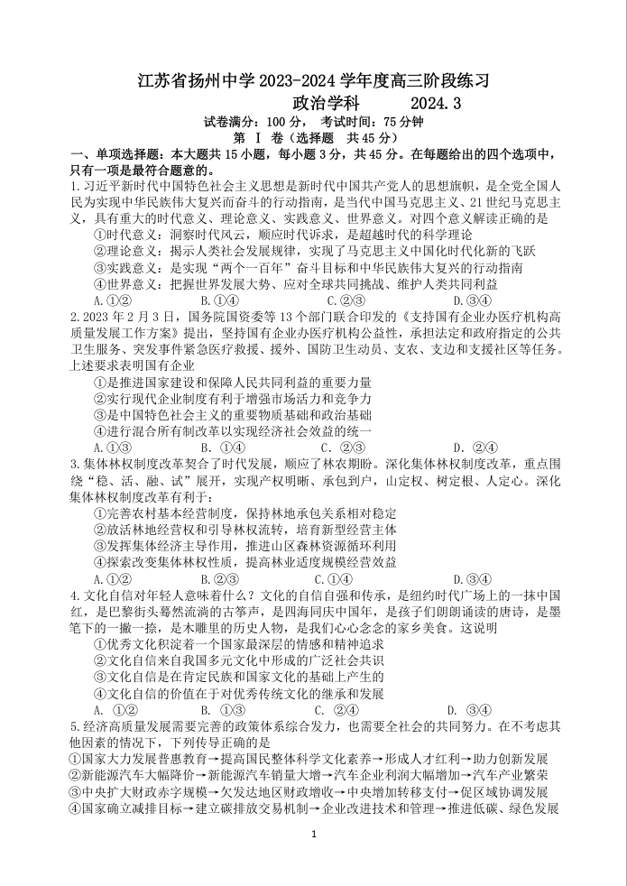 江苏省扬州中学2024届高三下学期阶段练习政治