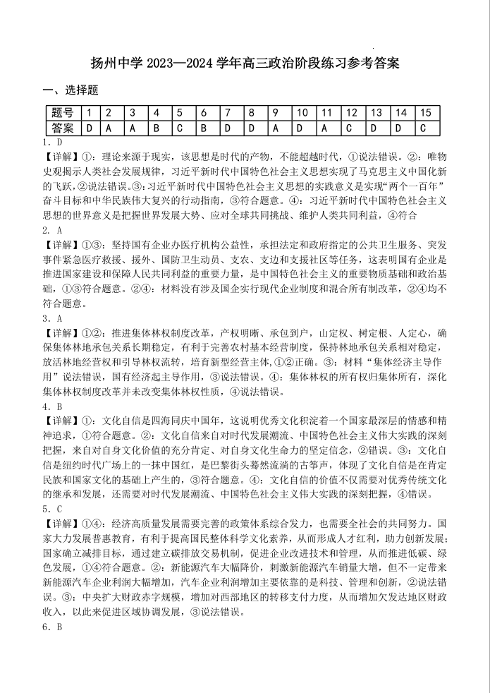 江苏省扬州中学2024届高三下学期阶段练习政治答案