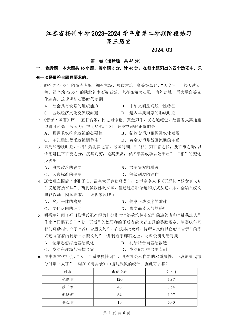江苏省扬州中学2024届高三下学期阶段练习历史