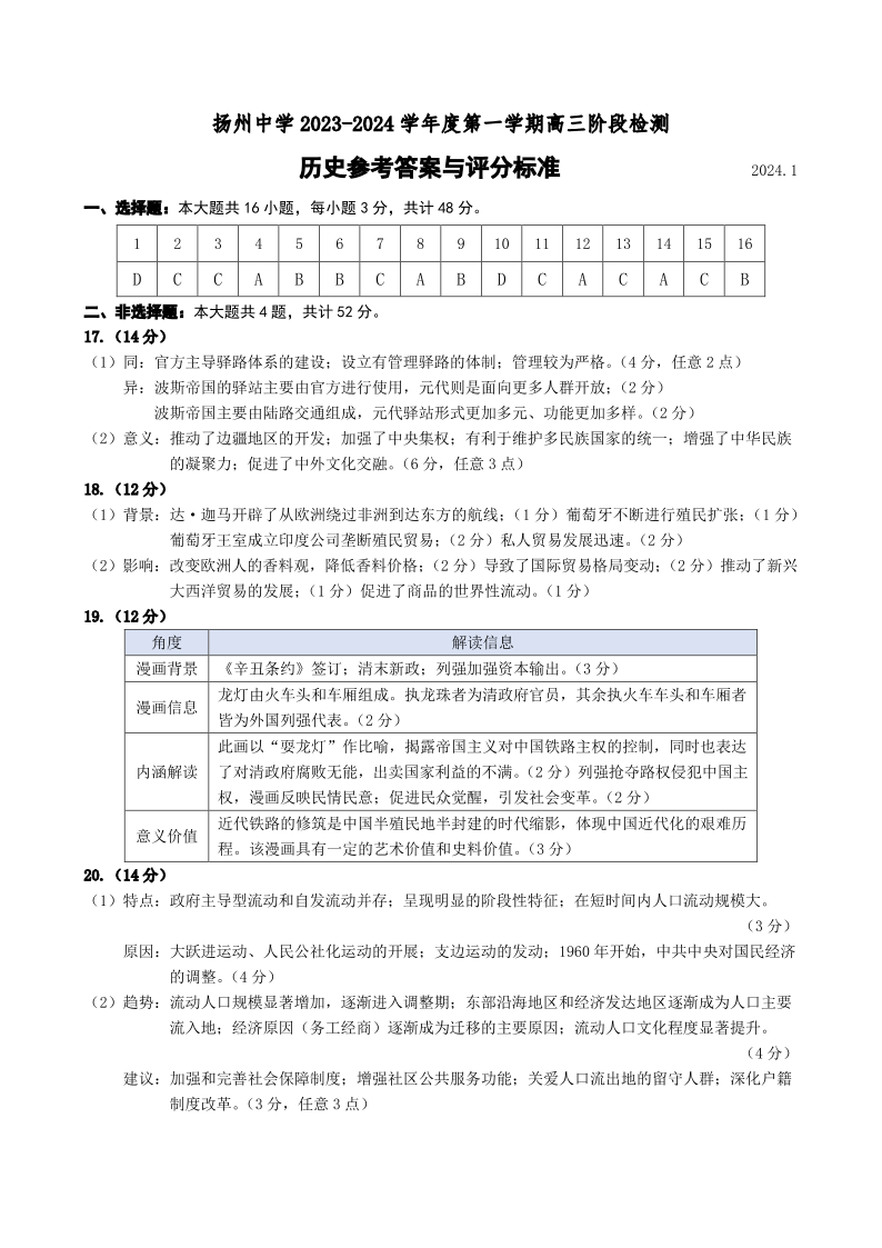 江苏省扬州中学2024届高三下学期阶段练习历史答案