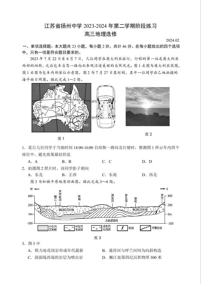 江苏省扬州中学2024届高三下学期阶段练习地理+答案