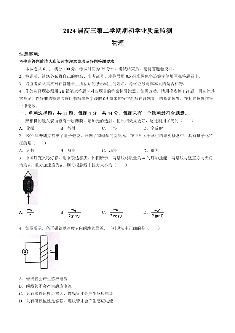 江苏省南通市海安市2024届高三上学期期初学业质量监测物理