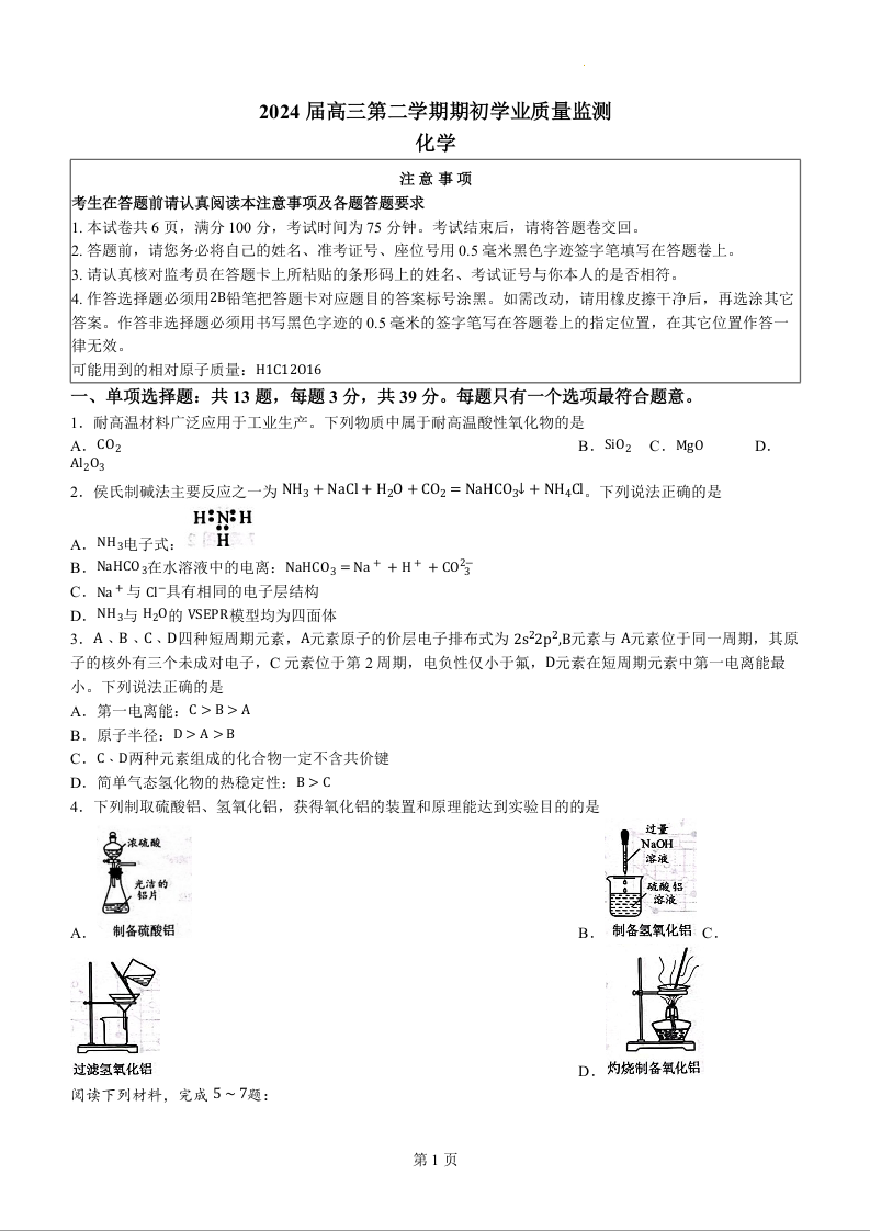 江苏省南通市海安市2024届高三上学期期初学业质量监测化学