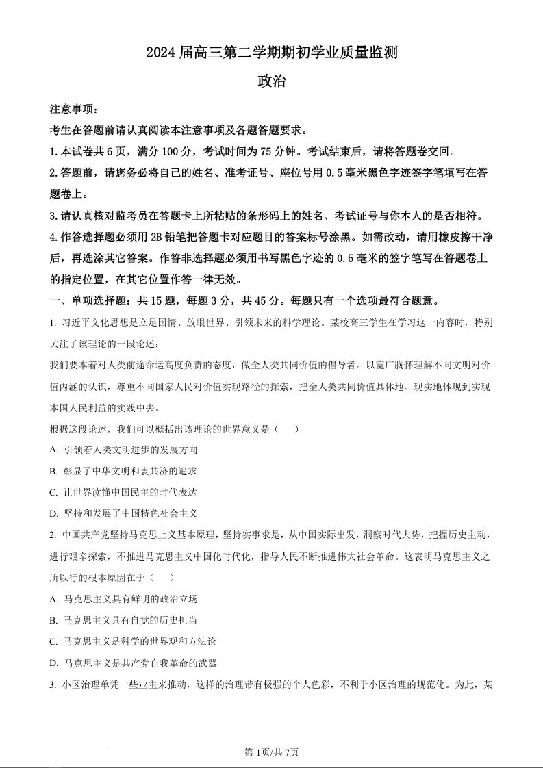 江苏省南通市海安市2024届高三上学期期初学业质量监测政治(原卷版)
