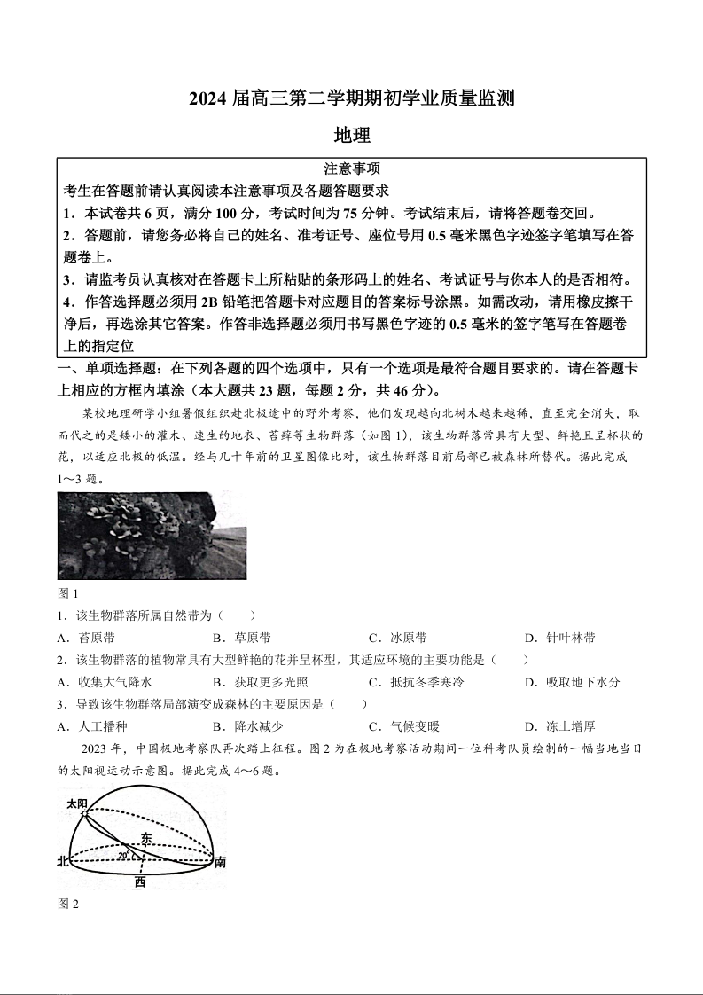 江苏省南通市海安市2024届高三上学期期初学业质量监测地理