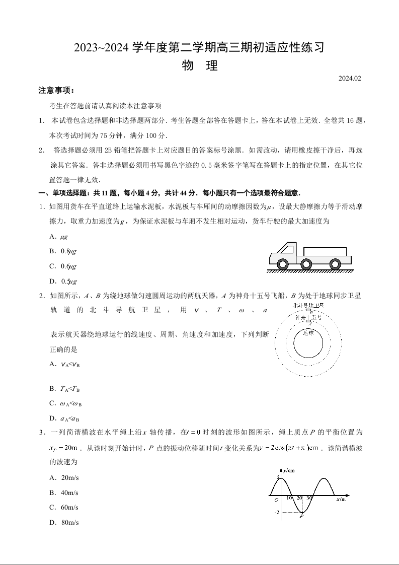 江苏省镇江市2024届高三下学期期初适应性练习物理
