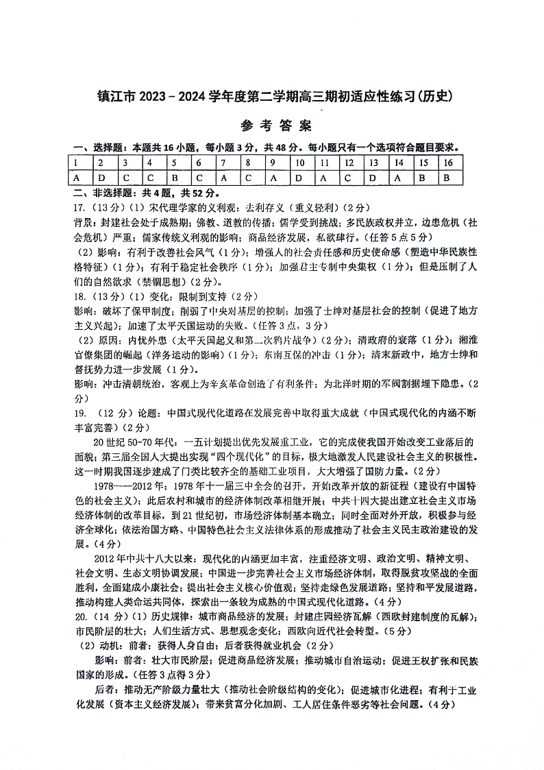 江苏省镇江市2024届高三下学期期初适应性练习历史答案