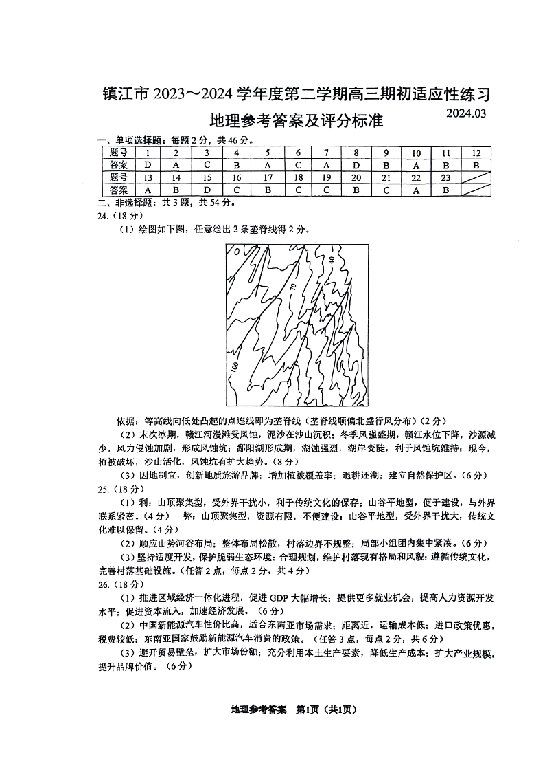 江苏省镇江市2024届高三下学期期初适应性练习地理答案