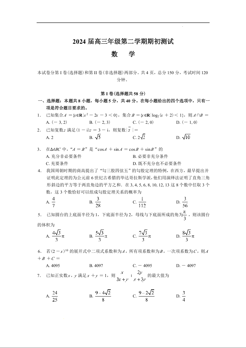 江苏四校2024届(苏高中+淮阴+海门+姜堰)高三下期初考试数学+答案