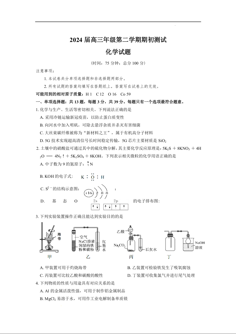 江苏四校2024届(苏高中+淮阴+海门+姜堰)高三下期初考试化学+答案