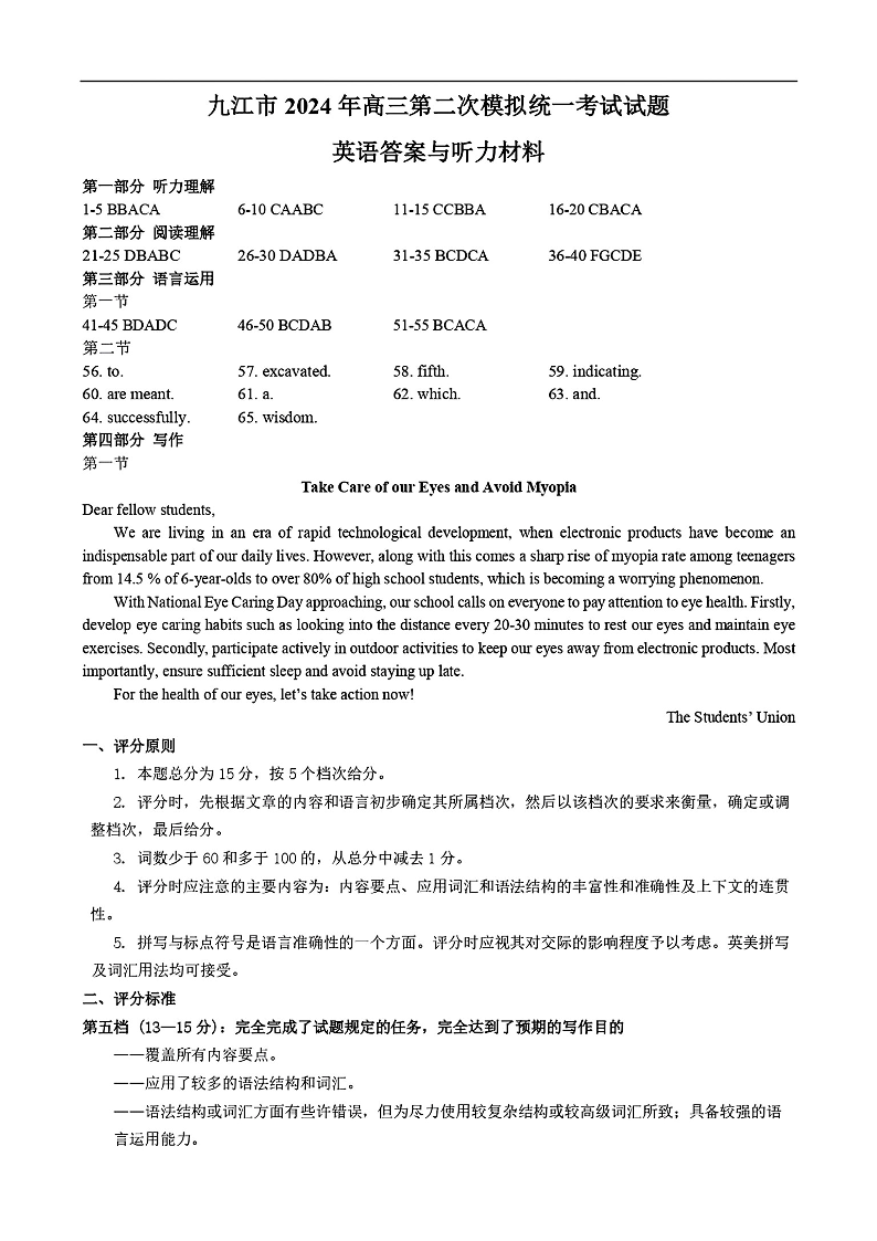 江西省九江市2024届高三下学期二模(九江二模)英语答案