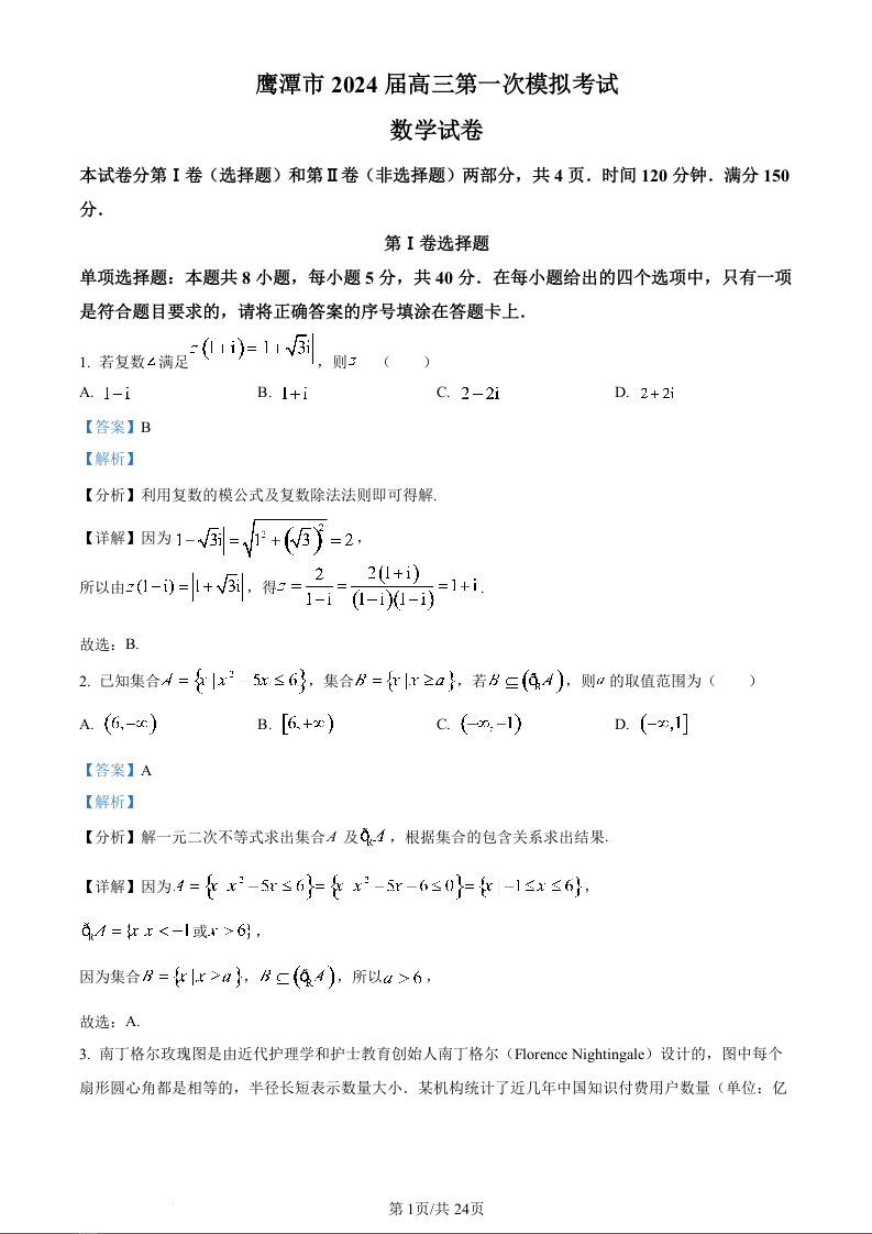 江西省鹰潭市2024届高三下学期第一次模拟考试(鹰潭一模)数学(精品解析版)