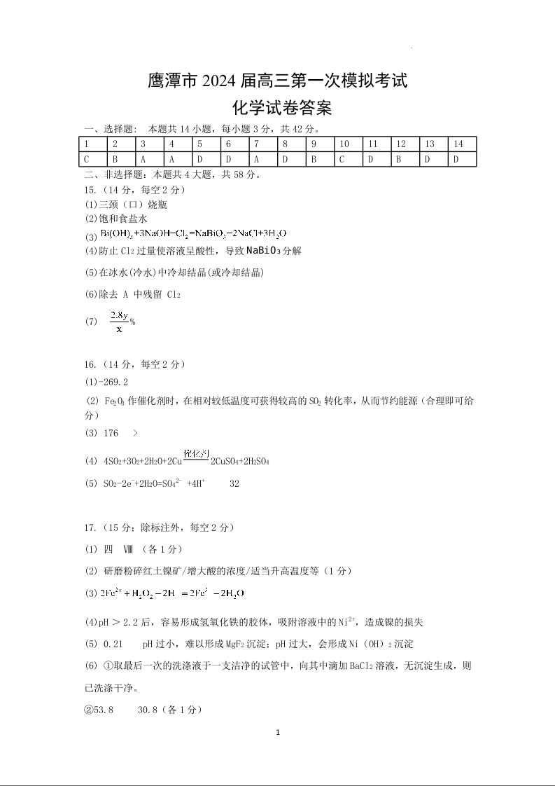 江西省鹰潭市2024届高三下学期第一次模拟考试(鹰潭一模)化学答案