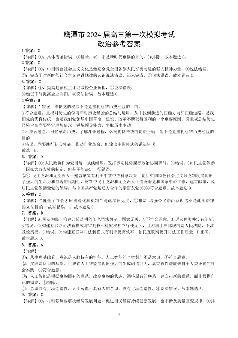 江西省鹰潭市2024届高三下学期第一次模拟考试(鹰潭一模)政治答案