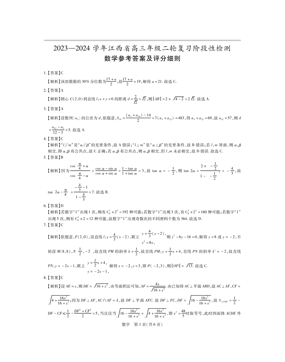 江西稳派上进联考2024届高三年级二轮复习阶段性测试数学答案