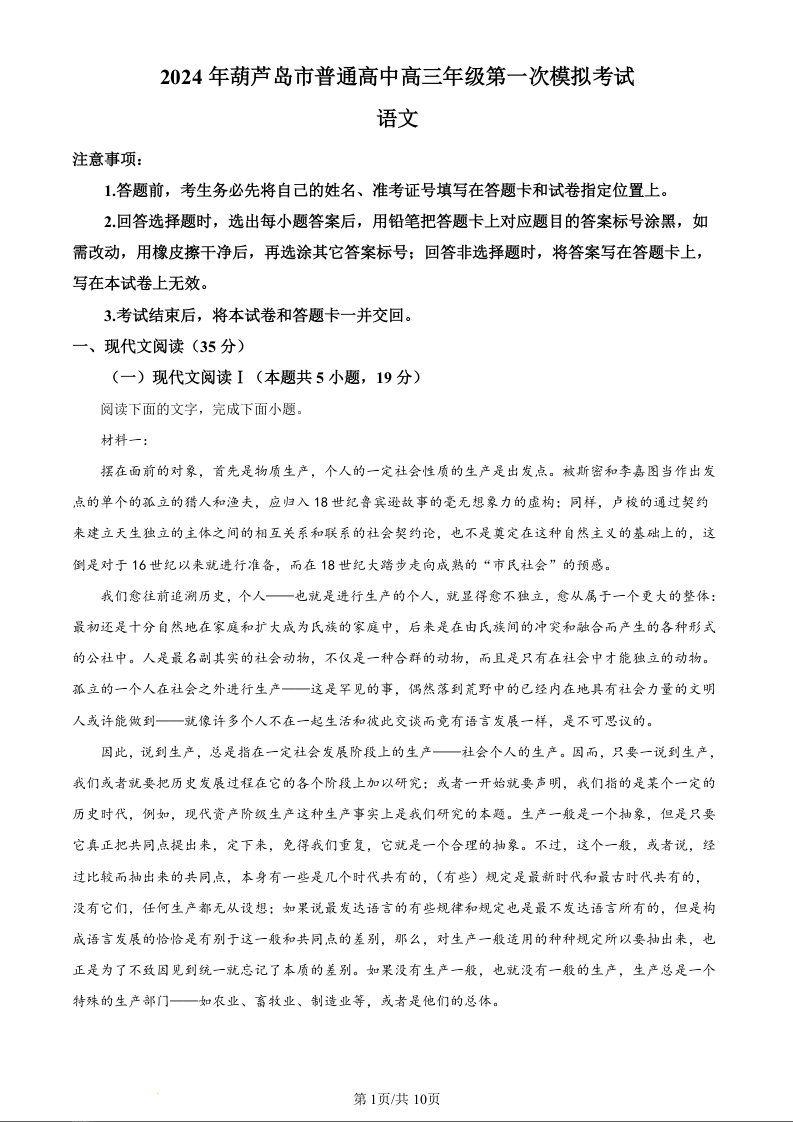 辽宁省葫芦岛市2024年普通高中高三年级下学期第一次模拟考试语文(原卷版)