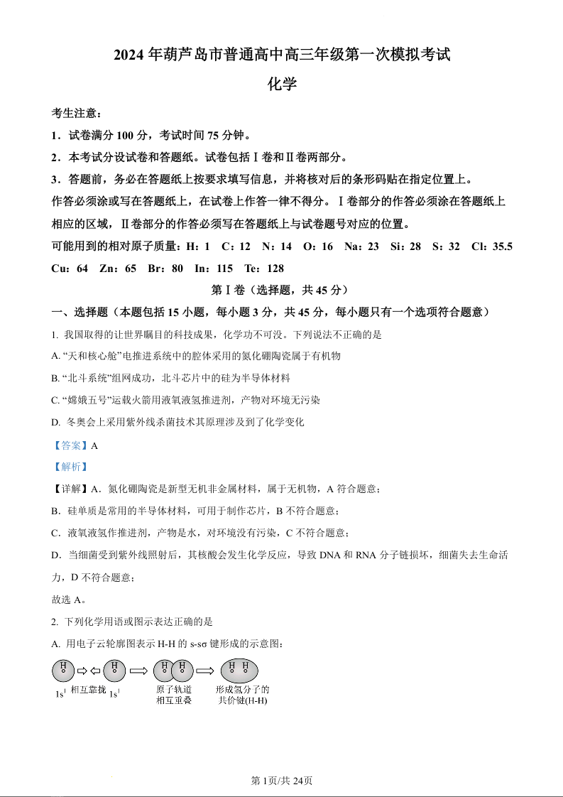 辽宁省葫芦岛市2024年普通高中高三年级下学期第一次模拟考试化学(精品解析版)